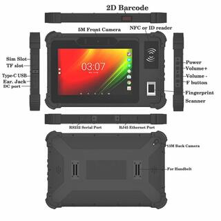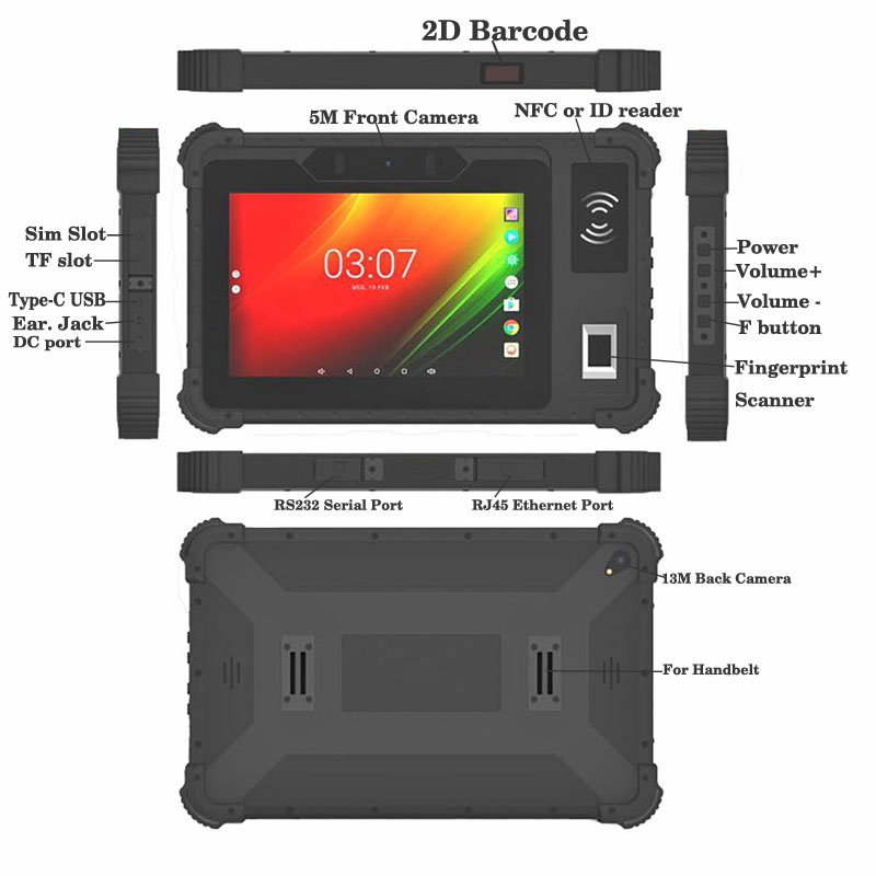 12.I/O ports:1*DC port,1* Ethernet RJ45 Port (optional),1*RS232 Serial port (optional),1*Type-C USB Port,1*Earphone jack,1*micro Sim card slot,1*TF card slot;